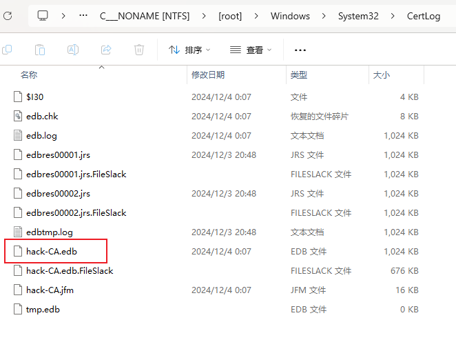 按照注册CA的名字,可以在C:\Windows\System32\CertLog中找到对应注册CA的日志edb文件
