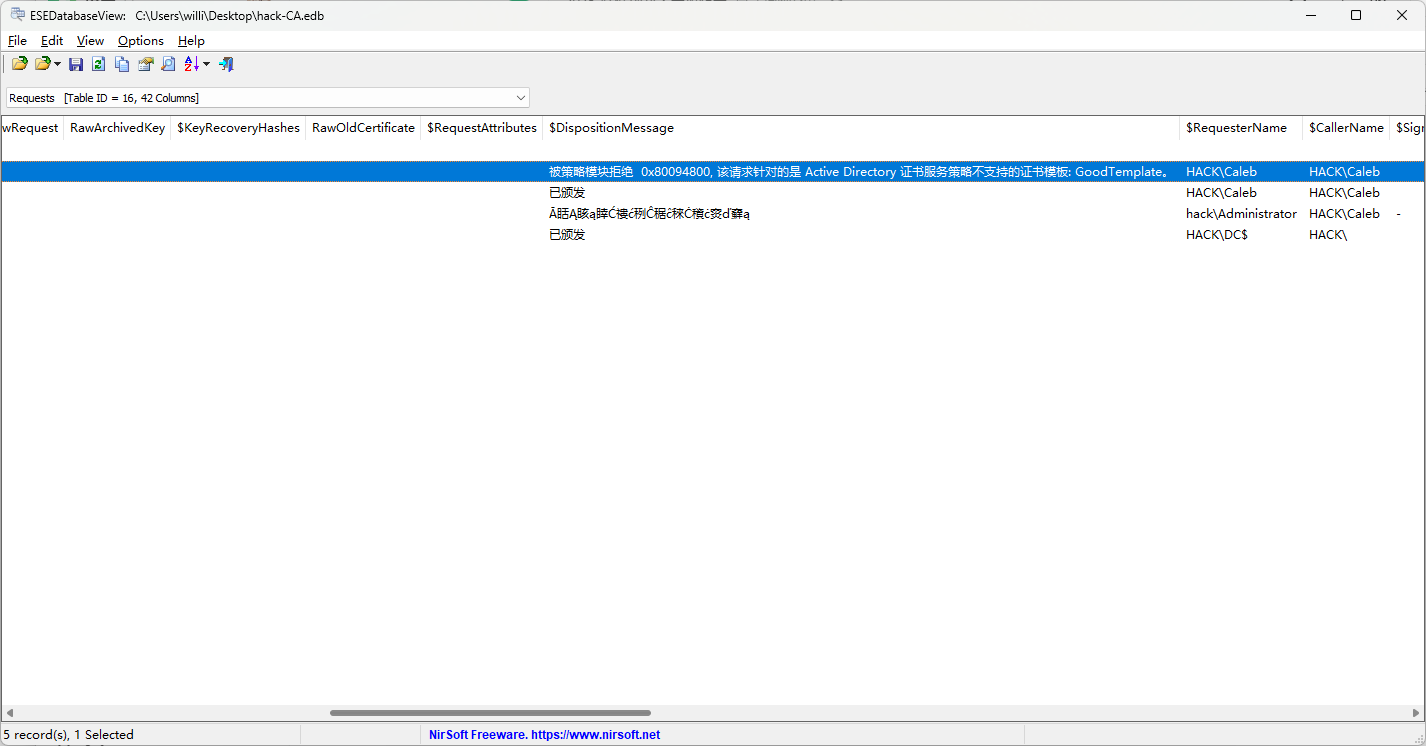 在Request表中,可以查看到证书的请求记录,这里找到GoodTemplate被拒绝的原因:
