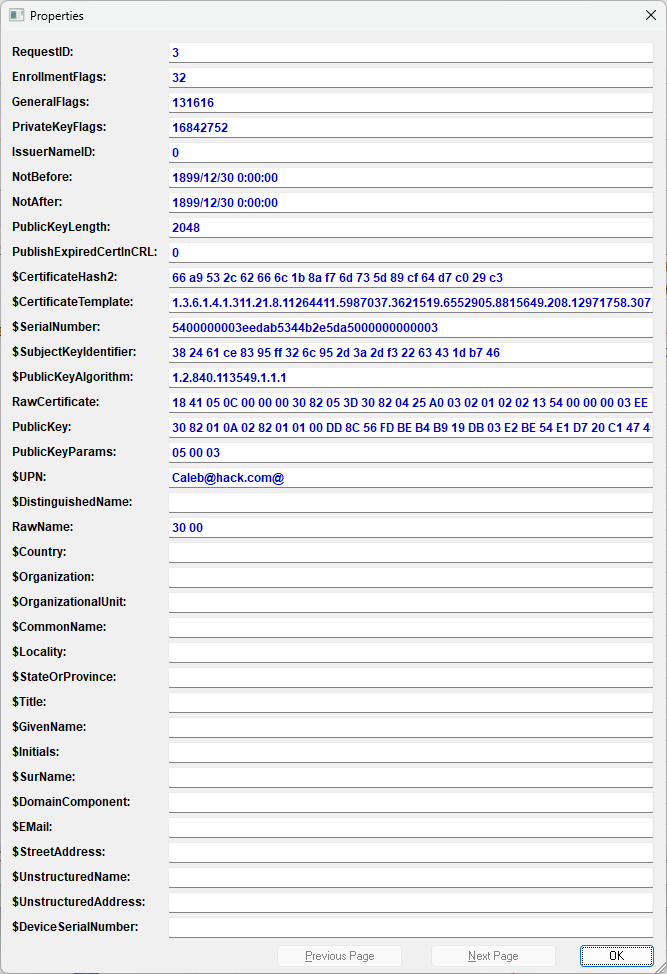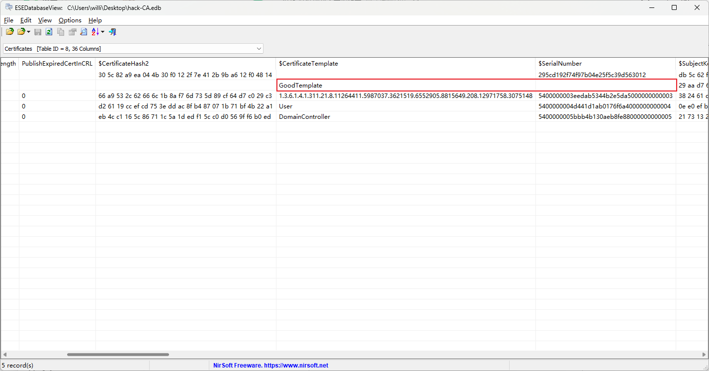 小梁的域控机器被黑客攻击了,请你找出一些蛛丝马迹。 攻击者通过AD CS提权至域管理员,在攻击过程中,攻击者使用有问题的证书模版注册了一张证书,该证书的证书模版名、证书序列号是什么?(格式为模版名-序列号,如CertTemplate-2f000000064287f6f5d6ff4a91000000000006)
