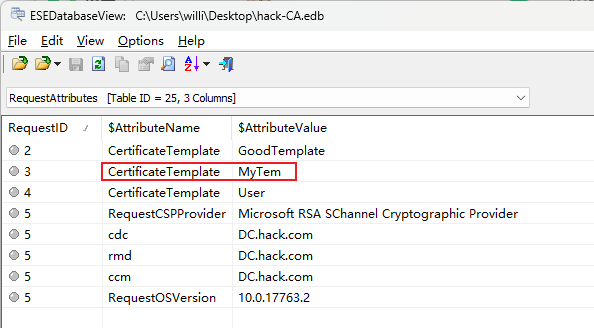 根据RequestID,能够确定这个就是有问题的证书模板,模板名为MyTem,序列号为5400000003eedab5344b2e5da5000000000003