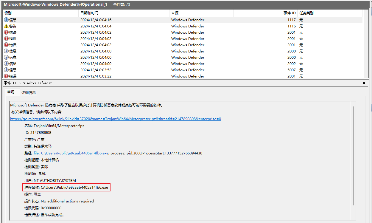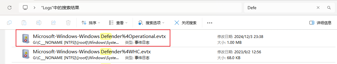 这里好说,Windows上基本都自带Windows Defender,被查杀了一定会有记录,我们可以直接去看Defender的日志,位置在C:\Windows\System32\winevt\Logs\