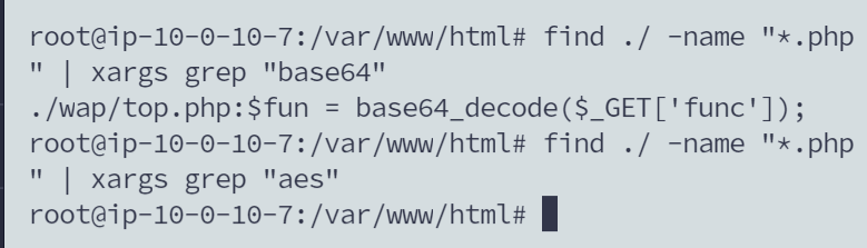 - 免杀Webshell马一般都是通过一些编码而来的,所以我们可以直接在Linux里面,使用管道符进行搜索含有编码加密的一些文件,如base64、AES等