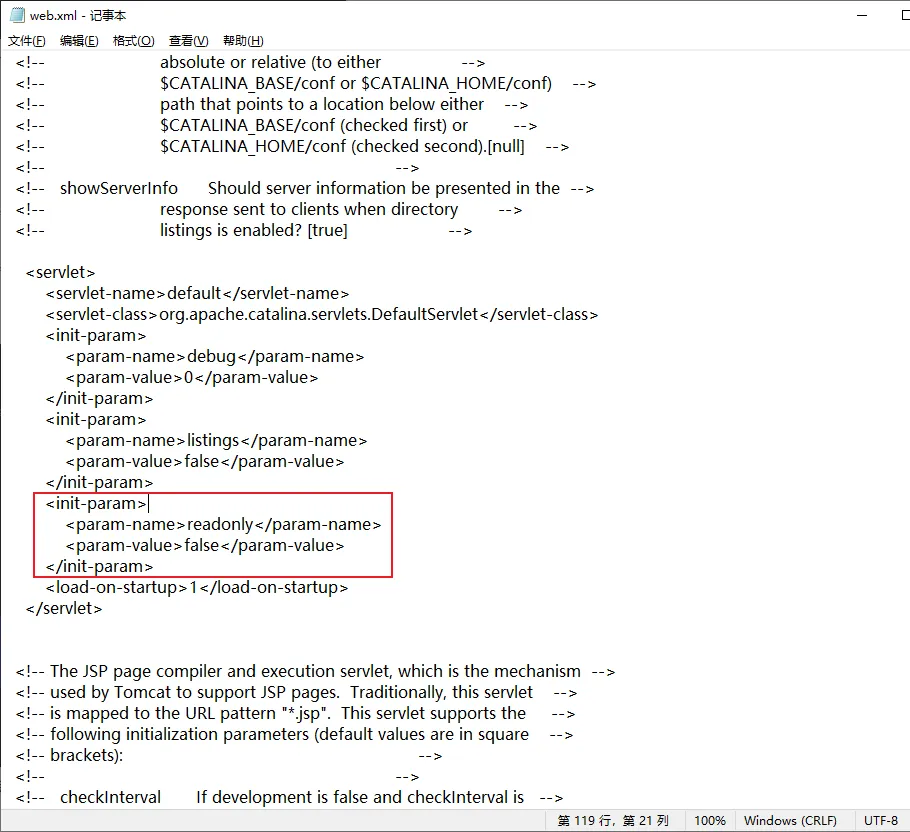 参考:https://www.nsfocus.com.cn/html/2017/39_0920/690.html,禁用conf/web.xml中的org.apache.catalina.servlets.DefaultServlet的初始化参数以缓解,即将此参数修改为true