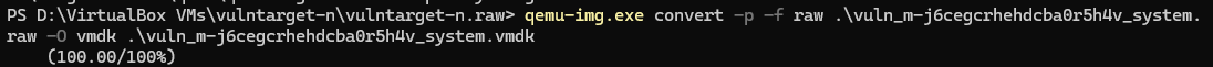 1 | qemu-img.exe convert -p -f raw vuln_m-j6cegcrhehdcba0r5h4v_system.raw -O vmdk vuln_m-j6cegcrhehdcba0r5h4v_system.vmdk |
