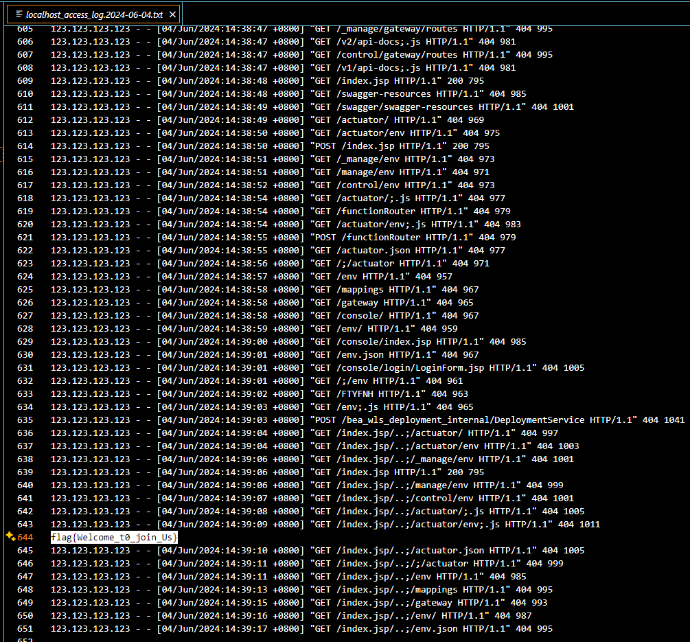 导出到本机看,发现2024-06-04,攻击IP:123.123.123.123扫描当前机器,并且获得一个flag