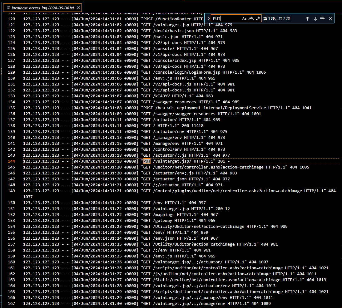 从访问日志筛选GET、POST、PUT等方法,发现两处PUT上传成功