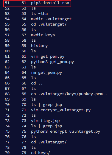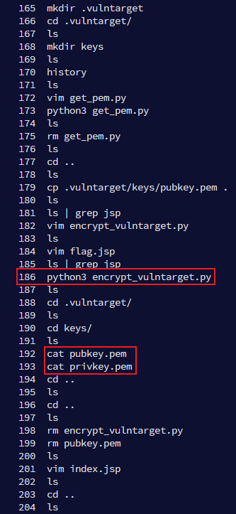 这样看好像只留下了私钥,前往/opt/tomcat/webapps/ROOT/.vulntarget/keys文件夹查看,发现公钥和私钥都知道了,从history里面还可以知道加密方式为rsa