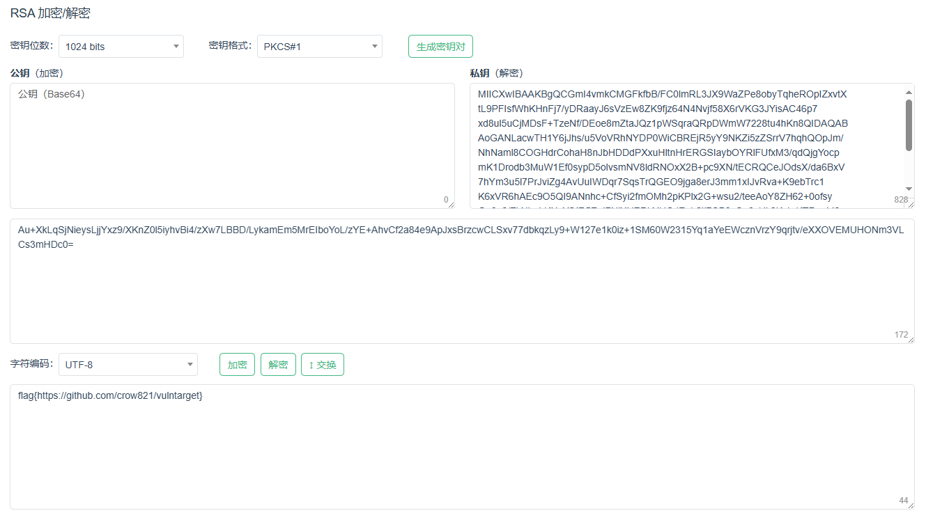 从本机获取信息处可以,加密方式为rsa,尝试拿flag.jsp.vulntarget和私钥来解密