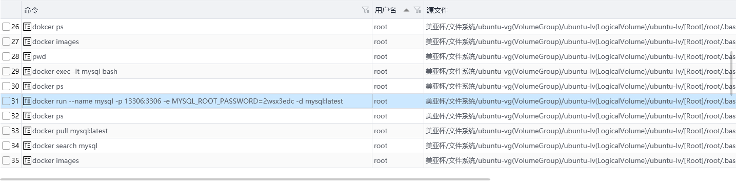 在分析虚拟机镜像时,可以看到其终端记录,里面包含了一条记录,是启动mysql的docker容器的