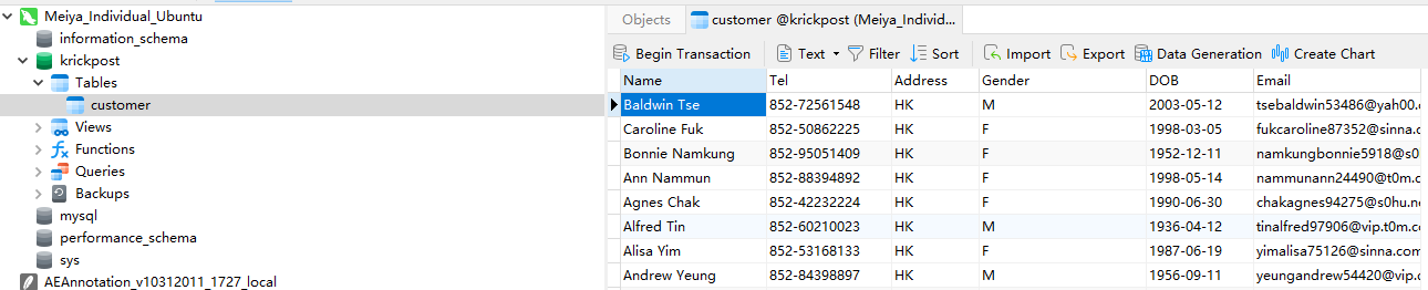 用这个密码登录mysql数据库,可以看到krickpost这个数据库里面的customer表存放着大量个人信息