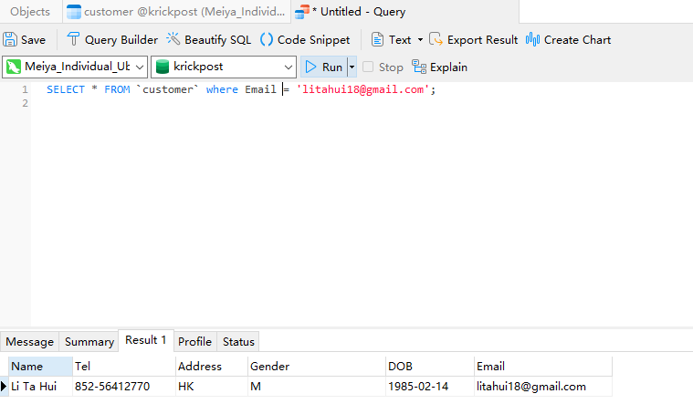 1 | SELECT * FROM `customer` where Email = 'litahui18@gmail.com'; |