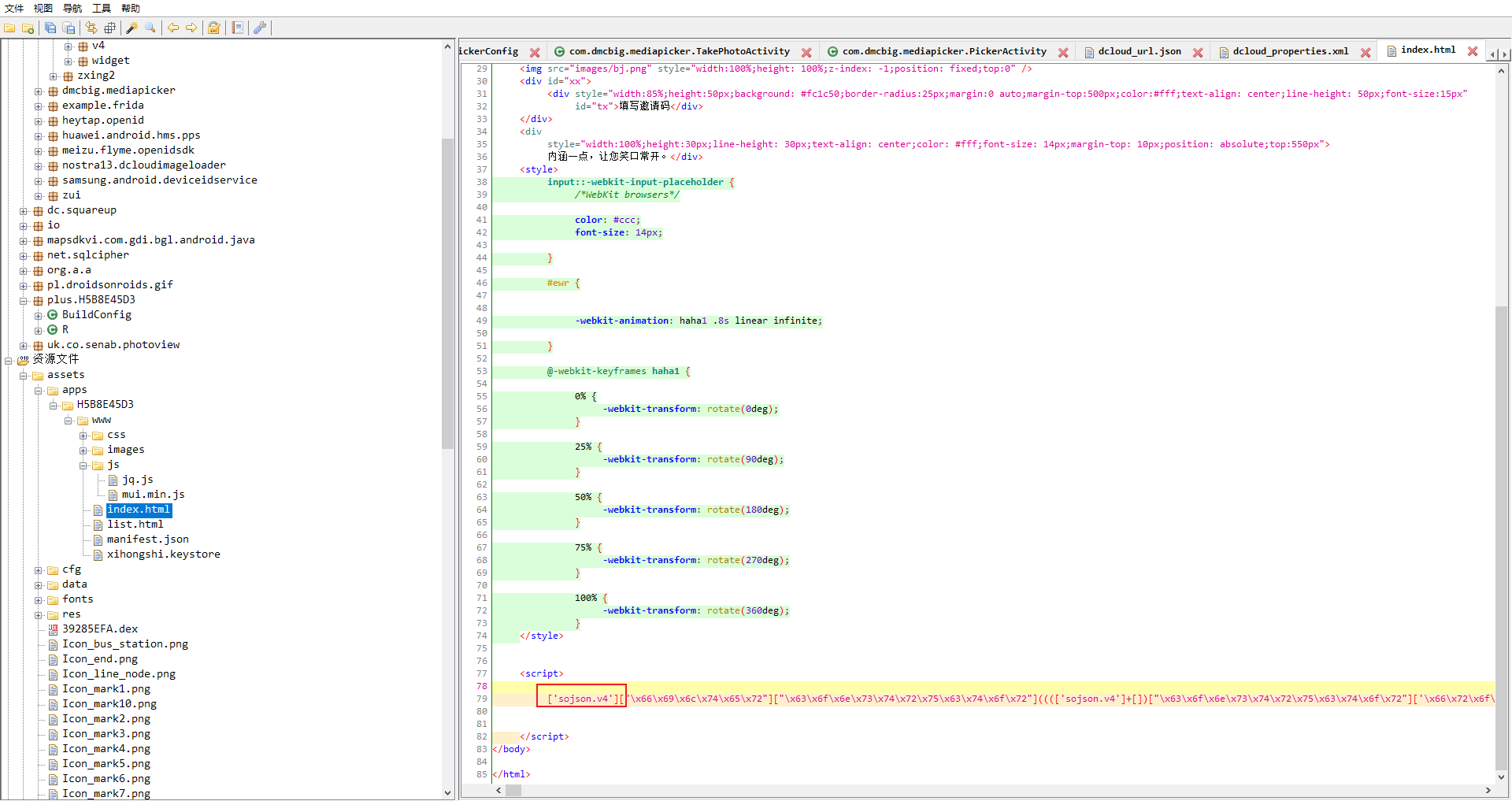 在apk的资源文件/assets/apps/H5B8E45D3/www/index.html中找到sojsonv4的加密字符串