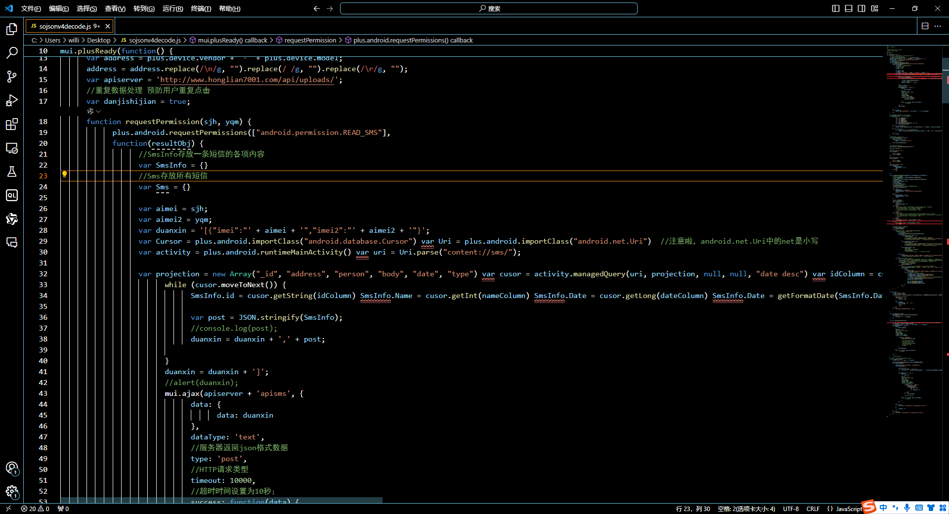 9 分析该APK,发现该程序还具备获取短信回传到后台的功能,短信上传服务器接口地址为【标准格式:www.abc.com/abc】