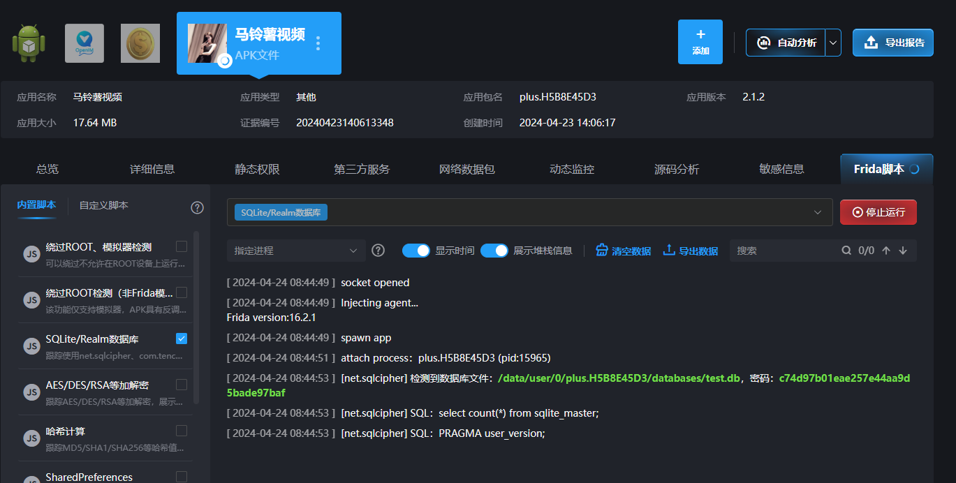 11 经分析,发现该APK在运行过程中会在手机中产生一个数据库文件,该数据库的初始密码为