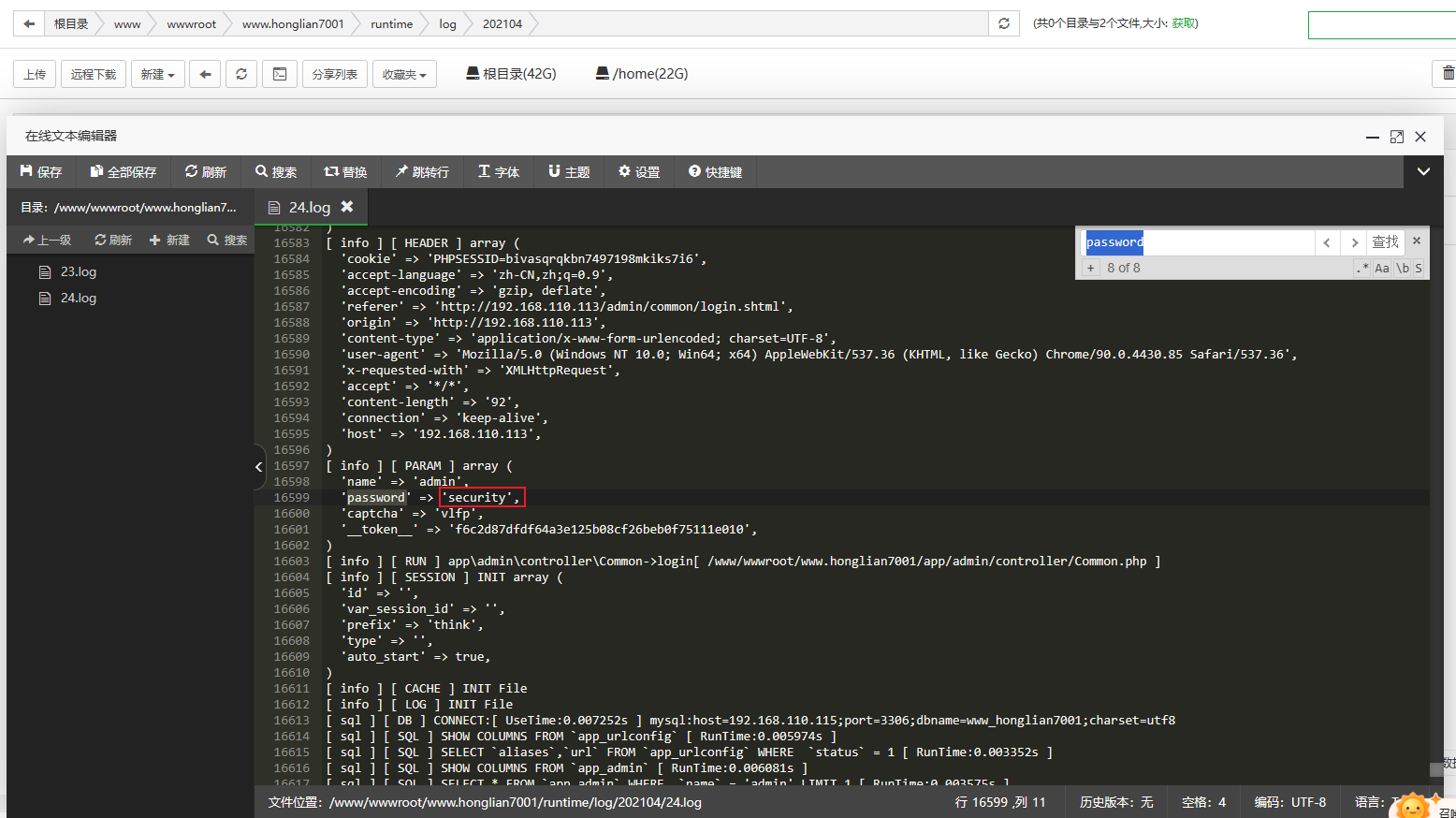 这里要分析网站的日志,位置在www.honglian7001/runtime/log/202104