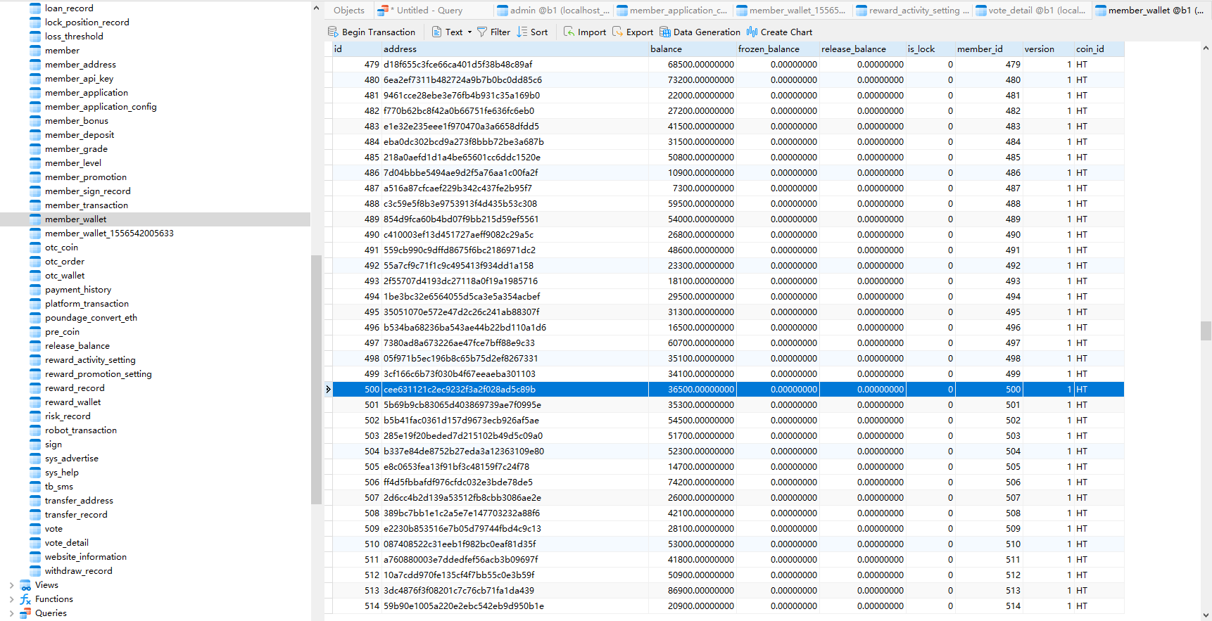 还原全部被删改数据,用户id为500的注册会员的HT币钱包地址为