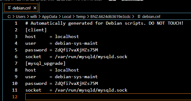 停止或重启服务都靠它,如果你修改了它的密码或覆盖掉密码,就会出现错误,查看/etc/mysql/debian.cnf查看内容,可以看到有这个mysql用户