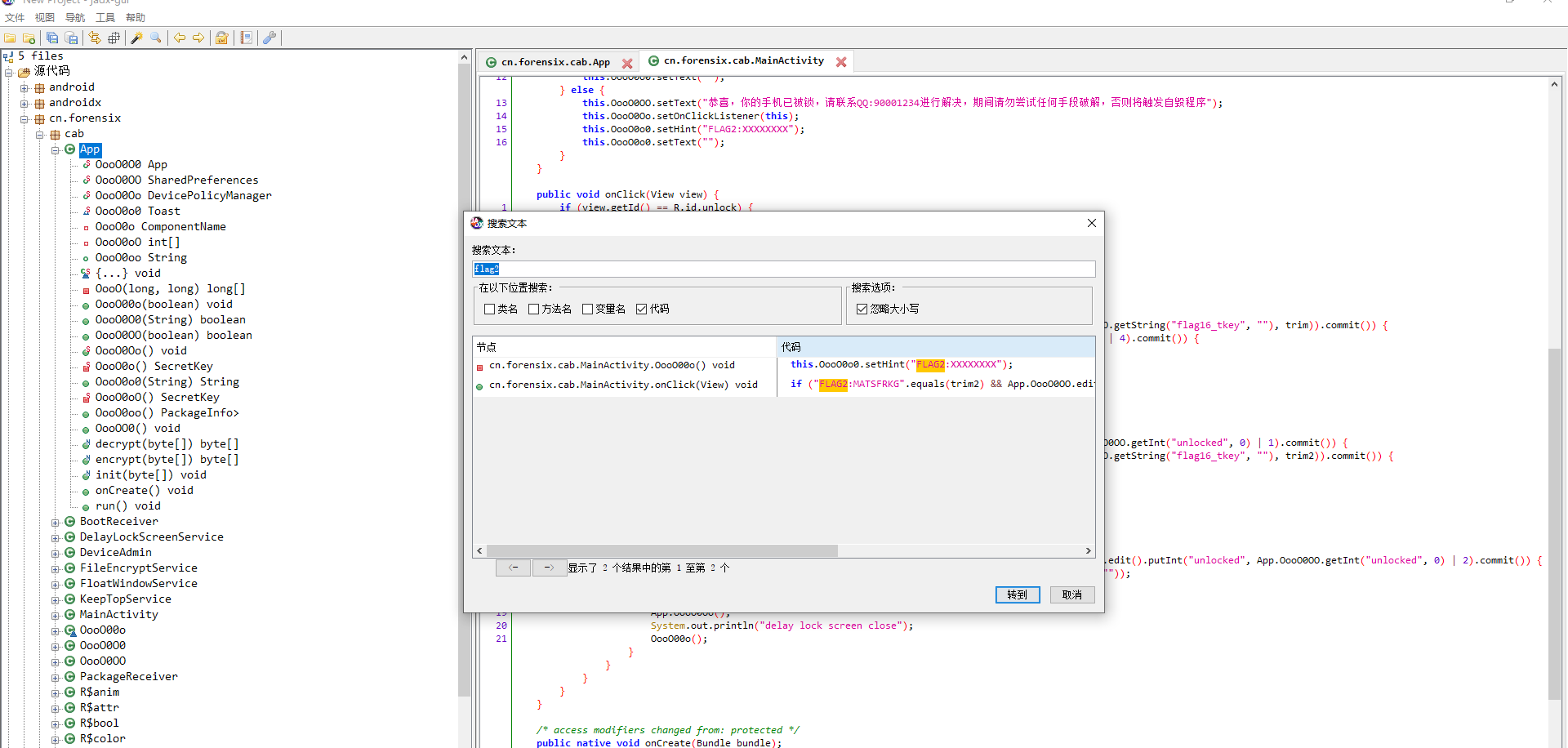 脱壳之后用jadx反编译,全局搜索flag2