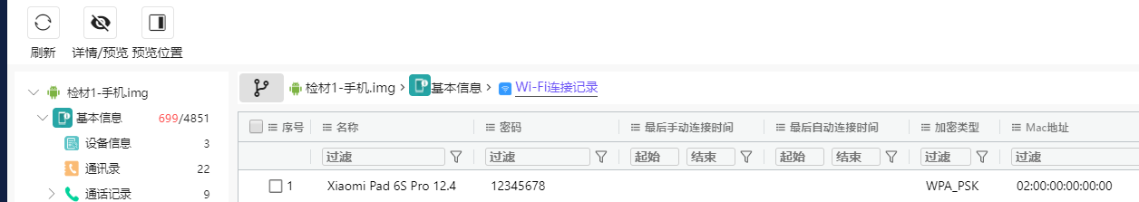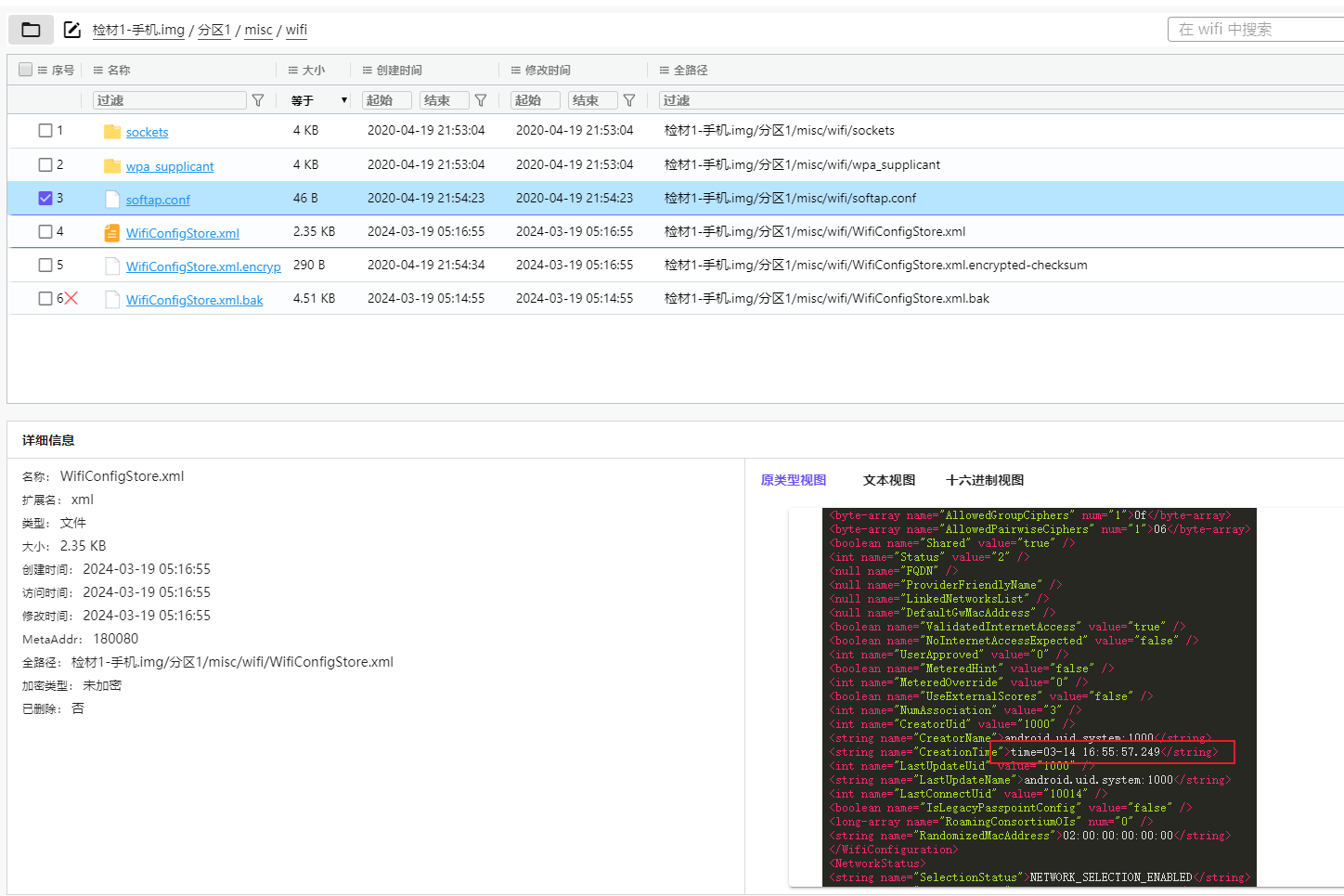 查找连接记录的源文件,在同级目录下面能找到WifiConfigStore.xml,创建时间就是第一次连接WiFi的时间