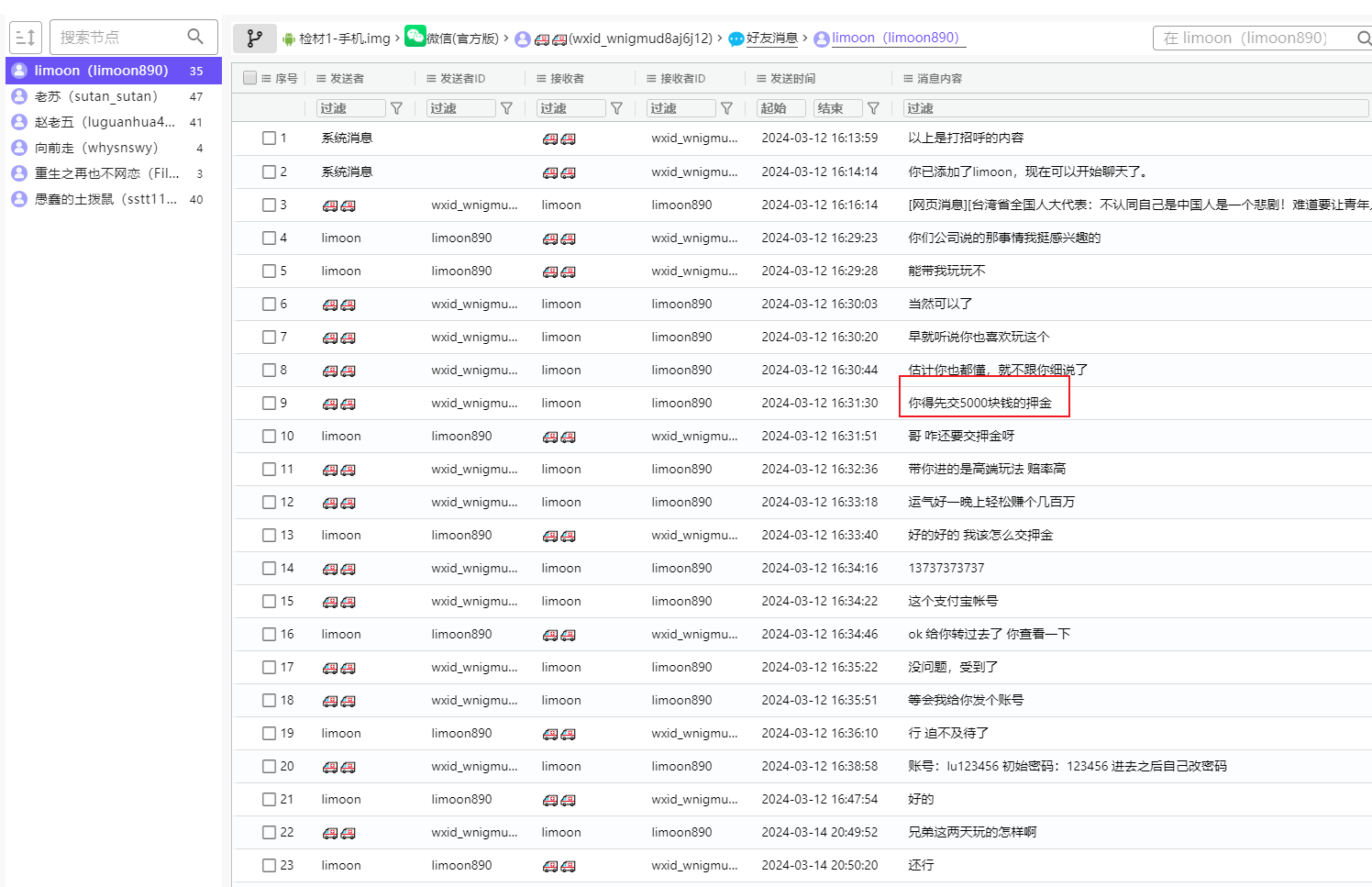 - 请分析嫌疑人手机,该案件团伙中,还有一名重要参与者警方未抓获,该嫌疑人所使用的微信账号ID为?【答题格式:wxid_abc123】