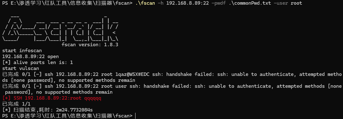 这里需要由Windows部分的字典进行爆破,这里用fscan对22端口进行爆破